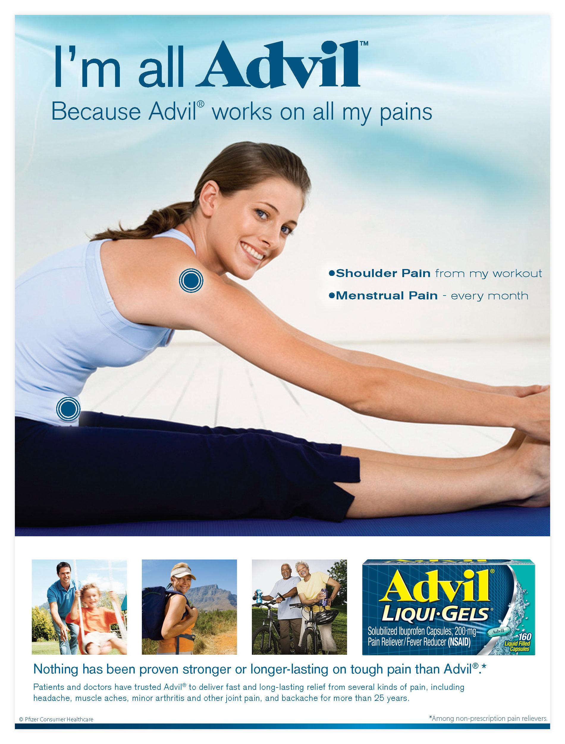 he world's #1 selling OTC pain reliever for tough aches and pains. This clean, fresh ad was designed to highlight the different reasons patients use Advil.