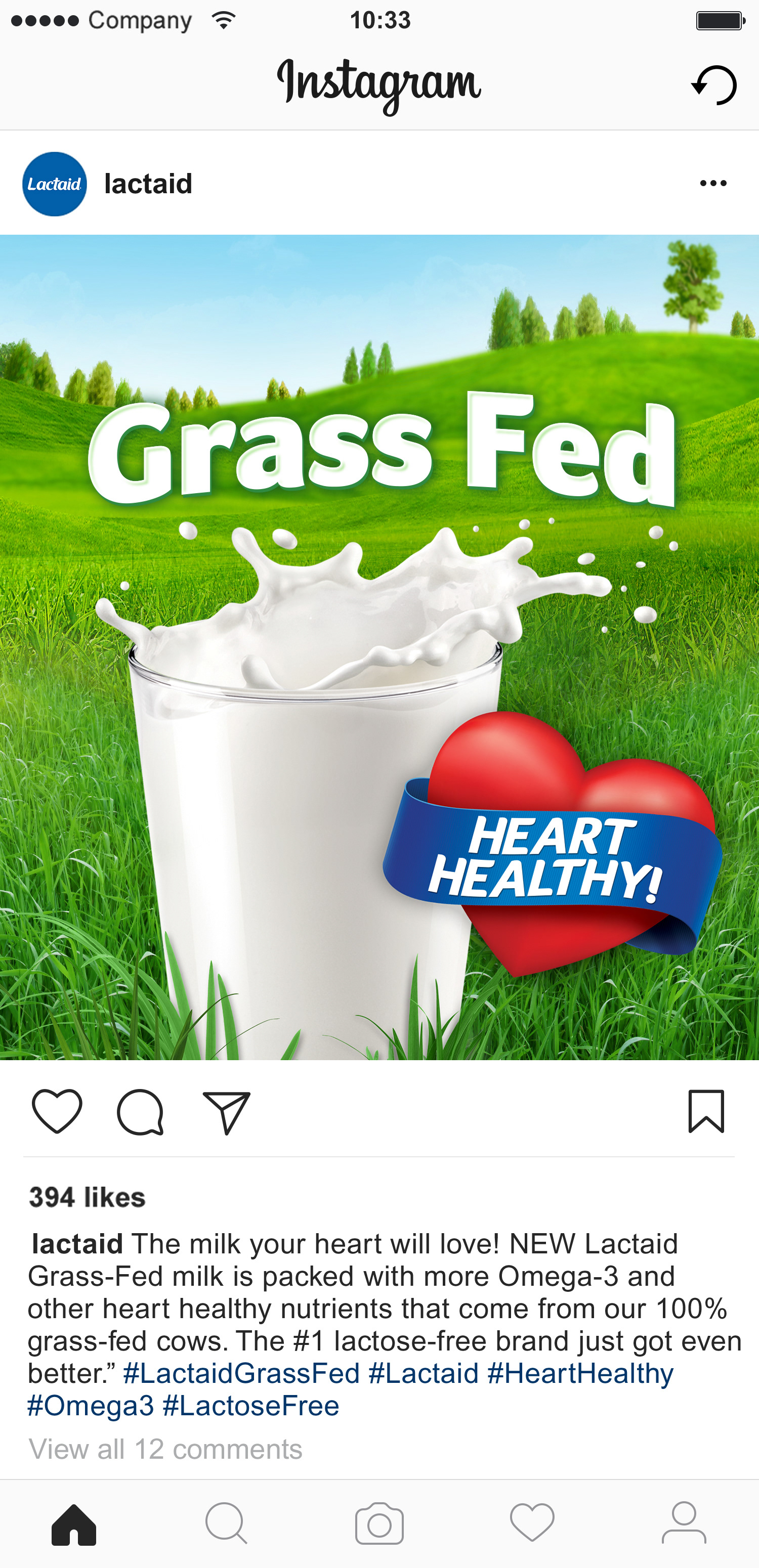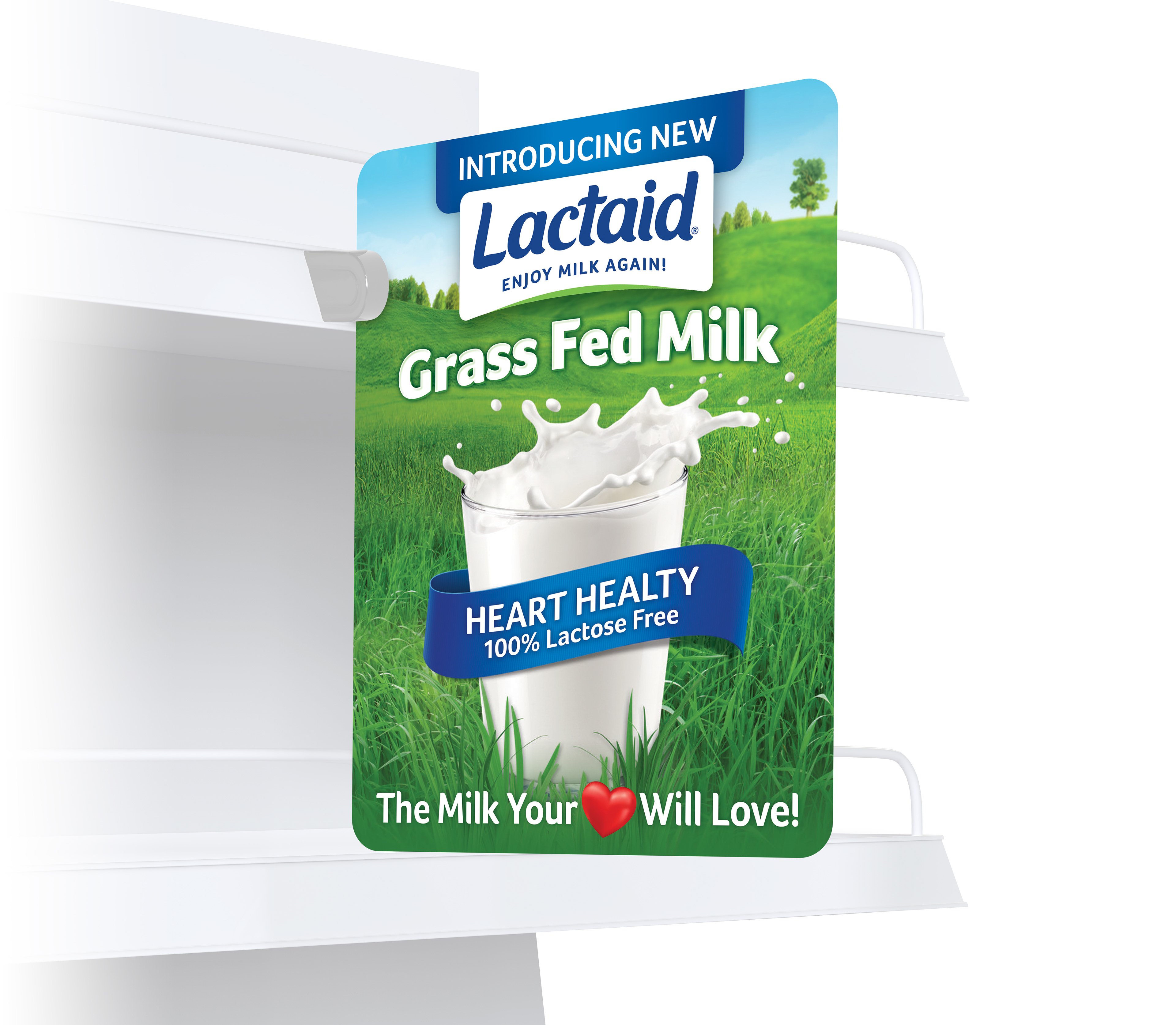 Concepts for new Lactiad Grass Fed Milk packaging, in-store signage and social media.
