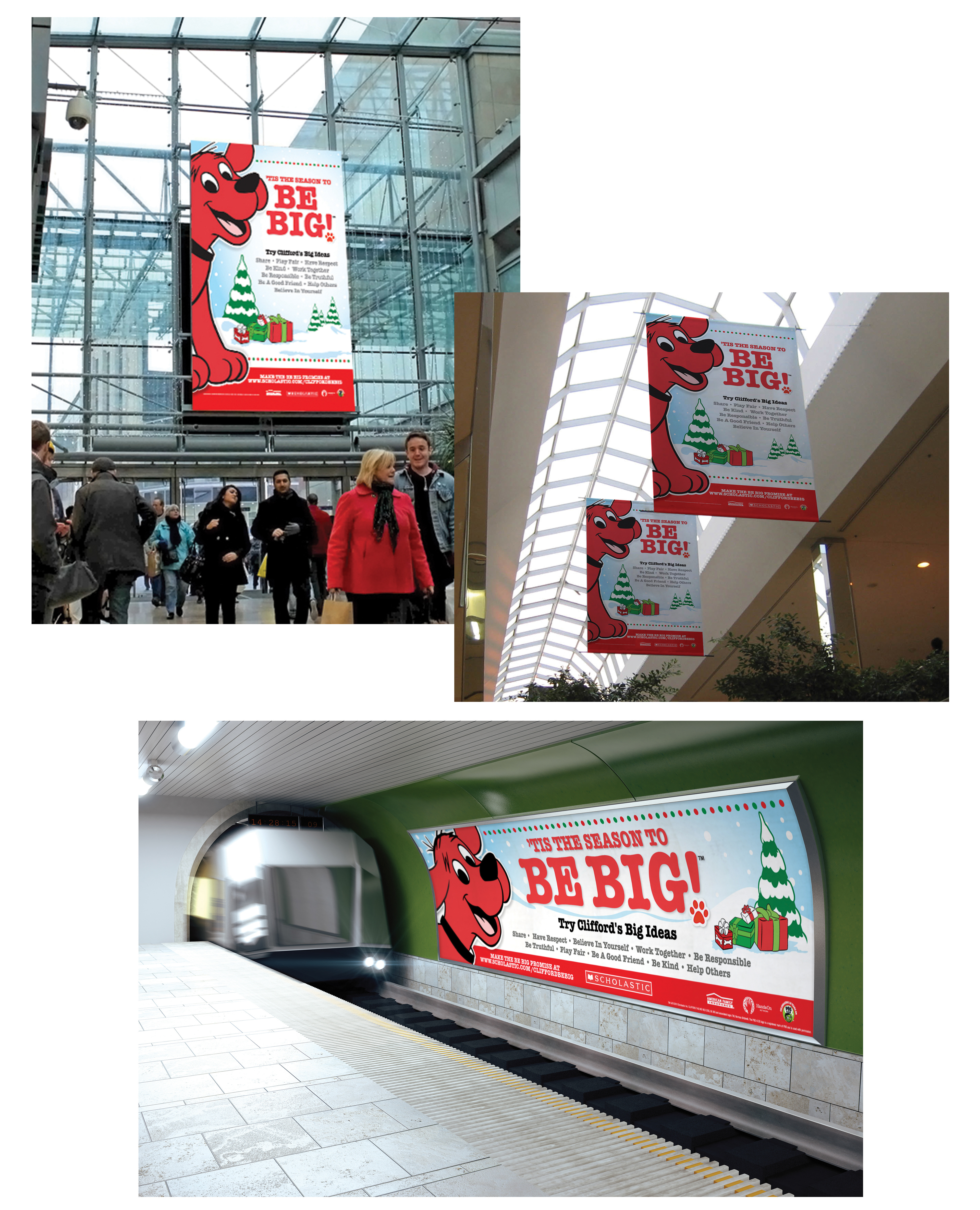 Clifford the Big Red Dog is Scholastic's official mascot and a favorite for parents, teachers and kids. Print ads and holiday themed environmental signage design.